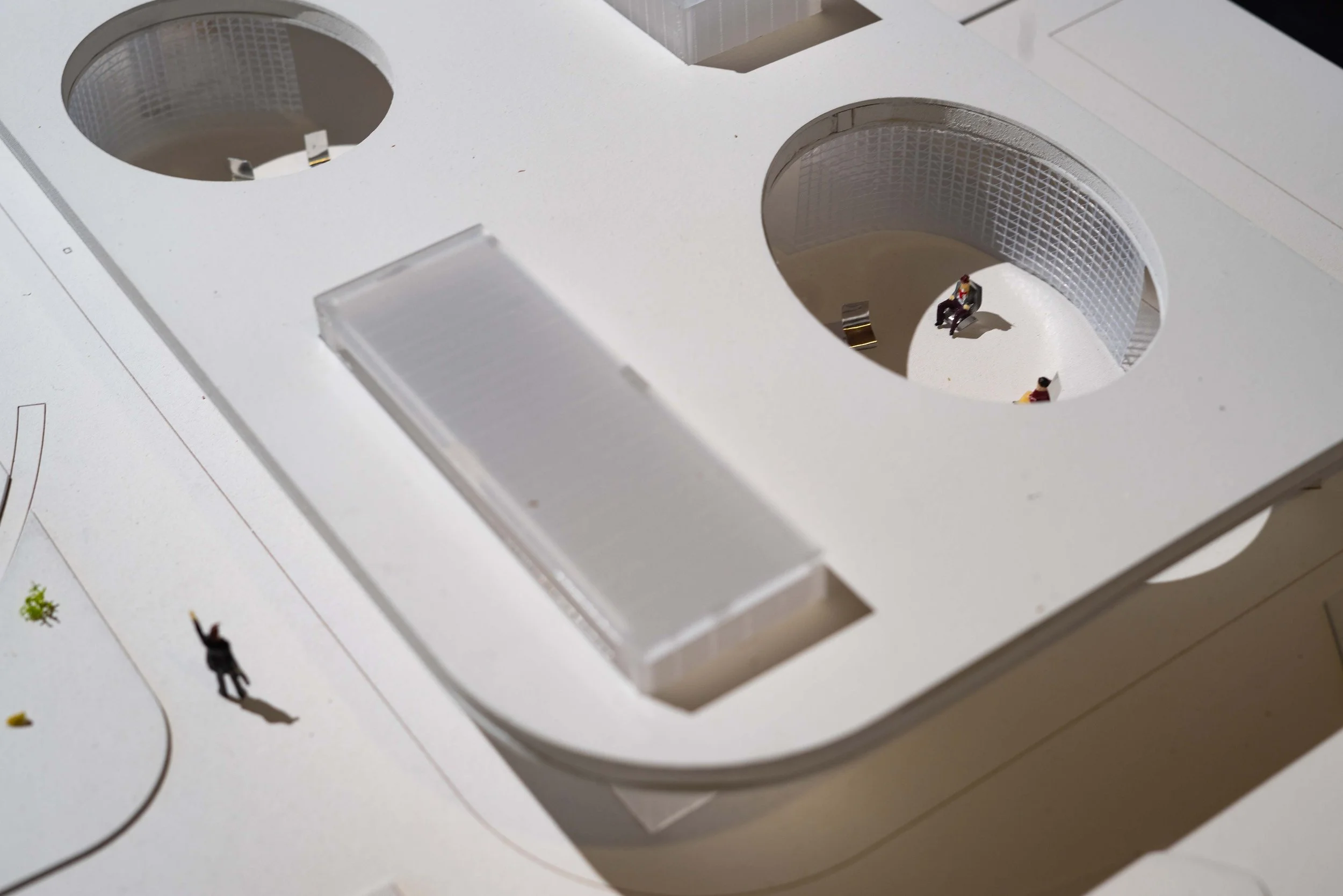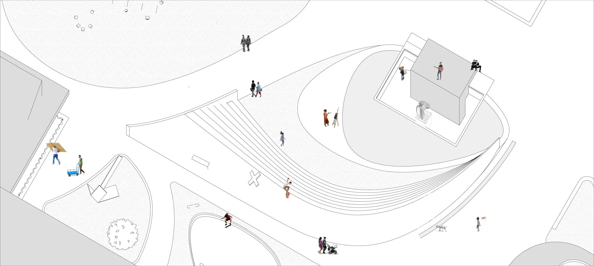 The Confetti Monument design is inspired from the idea of flexible, temporal and multiuse spaces that celebrate the Syracuse community. The movable “confetti” consisting of art, sculptures, seating and play objects, that invite the locals toward other monumental features such as the sunken courtyard, skating bowls, rock climbing wall and lush park space for events.